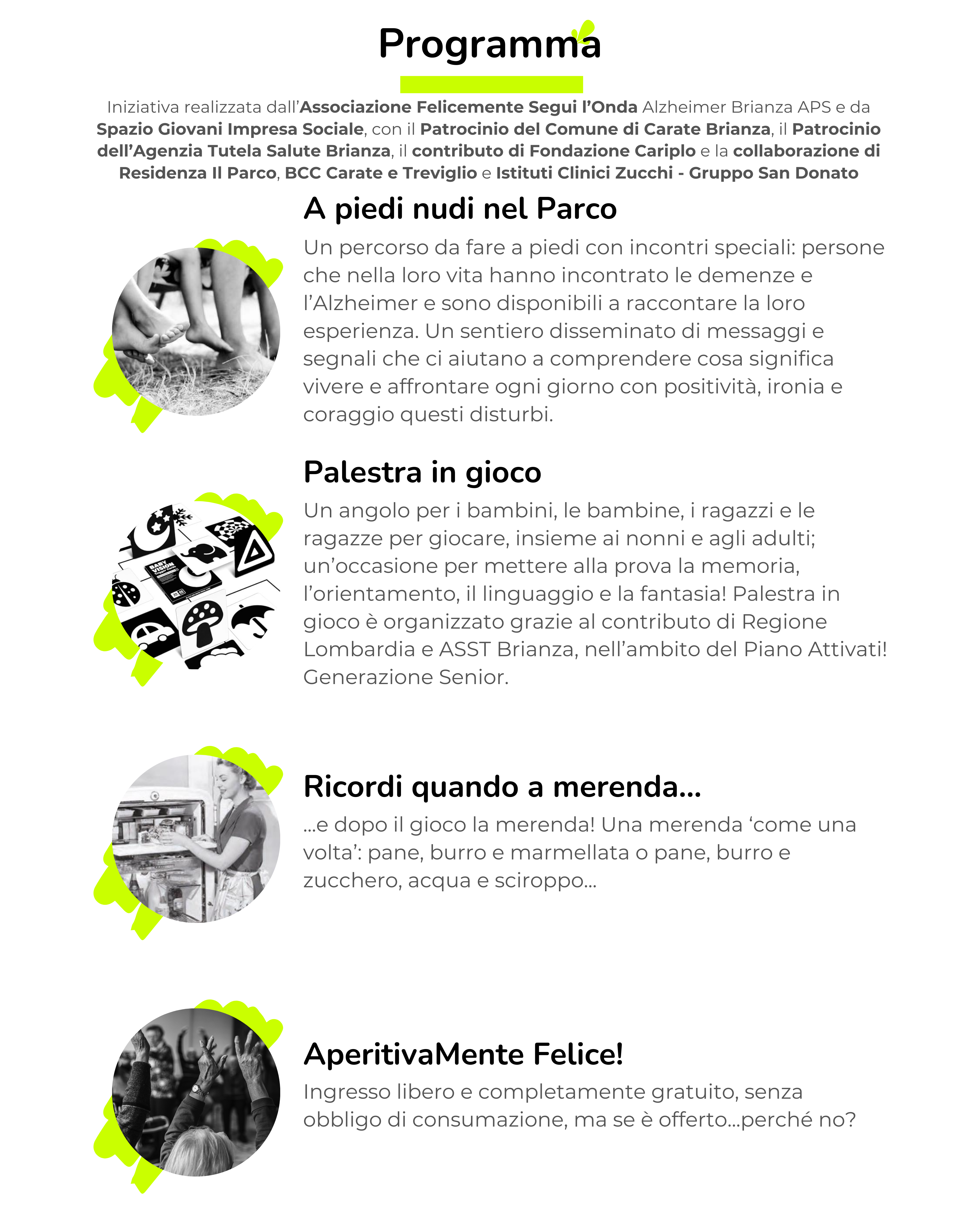 In occasione della 32° Giornata Mondiale dell’Alzheimer il Comune di Carate Brianza, Comunità amica della demenza, in collaborazione con l’Associazione Felicemente Segui l’Onda, a Spazio Giovani Impresa Sociale ed ad altri servizi del territorio, organizzano un pomeriggio dedicato alla patologia Alzheimer, patologia che coinvolge in tutto il mondo milioni di persone.