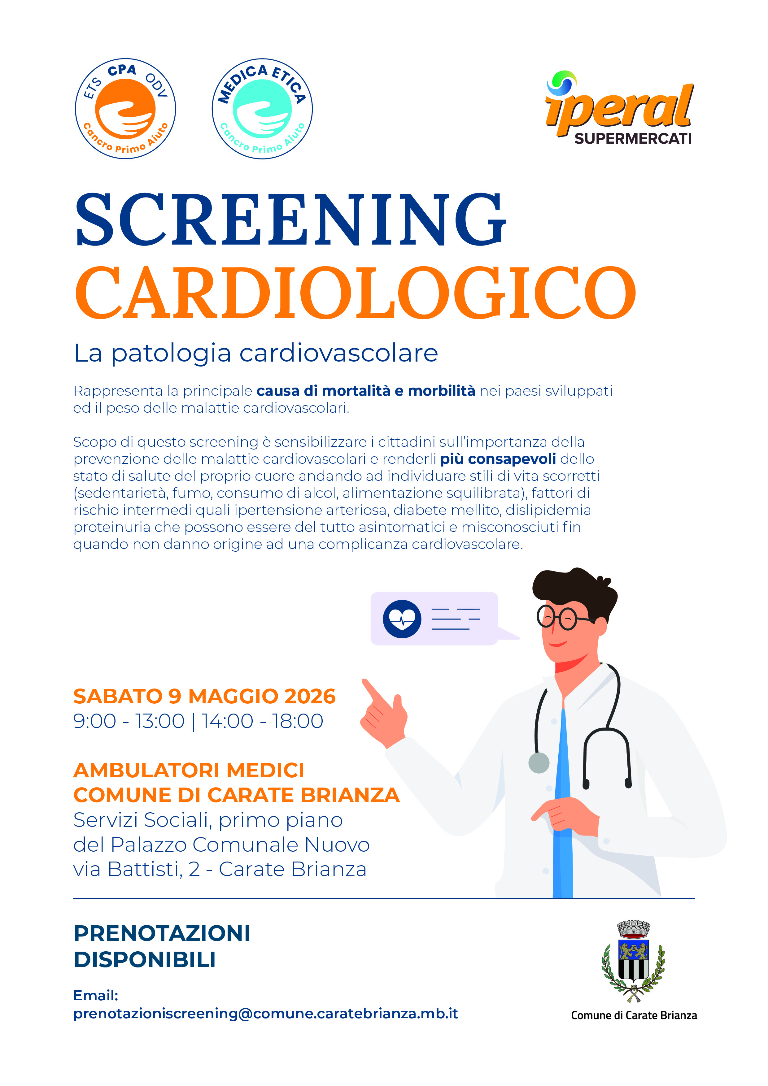Il Comune di Carate Brianza, in collaborazione con Cancro Primo Aiuto (CPA) e Medica Etica, promuove una giornata dedicata alla salute del cuore e alla prevenzione delle patologie cardiovascolari.